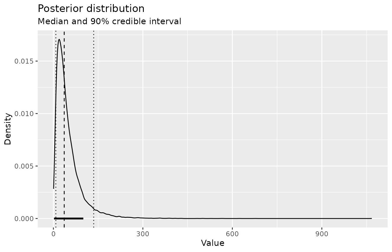 Finally, take a quick look at the posterior distribution. The dashed line marks the median; dotted lines are the 90% credible interval.